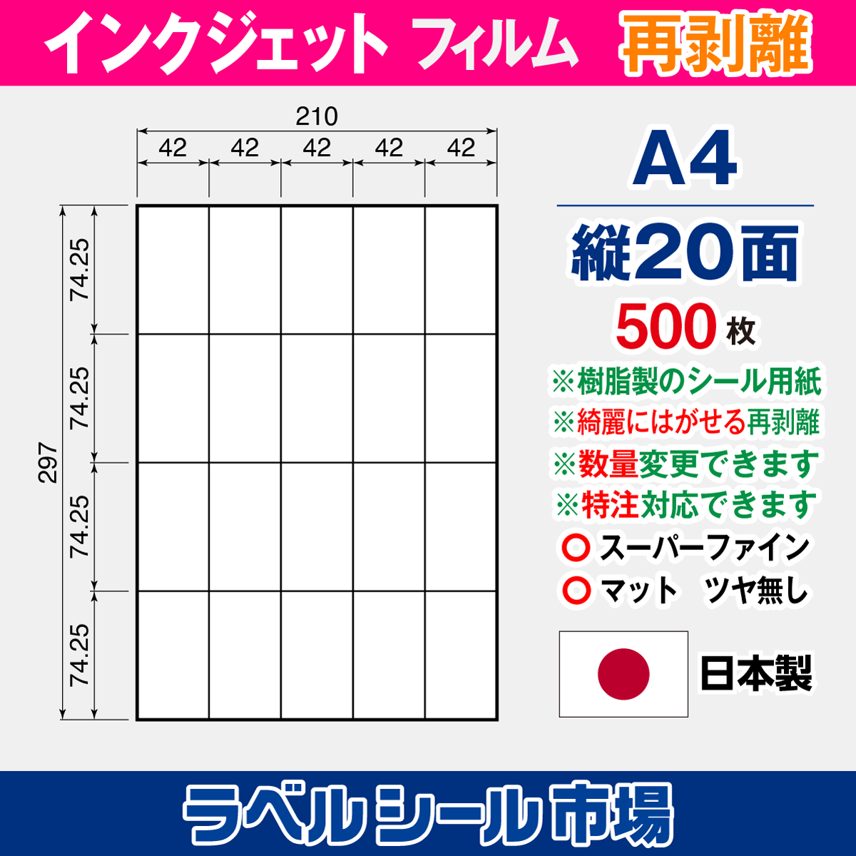 | A4-縦20面 500枚 フィルムT5Y4iDrh しっかり貼れて綺麗に剥がせる再剥離です。 | |