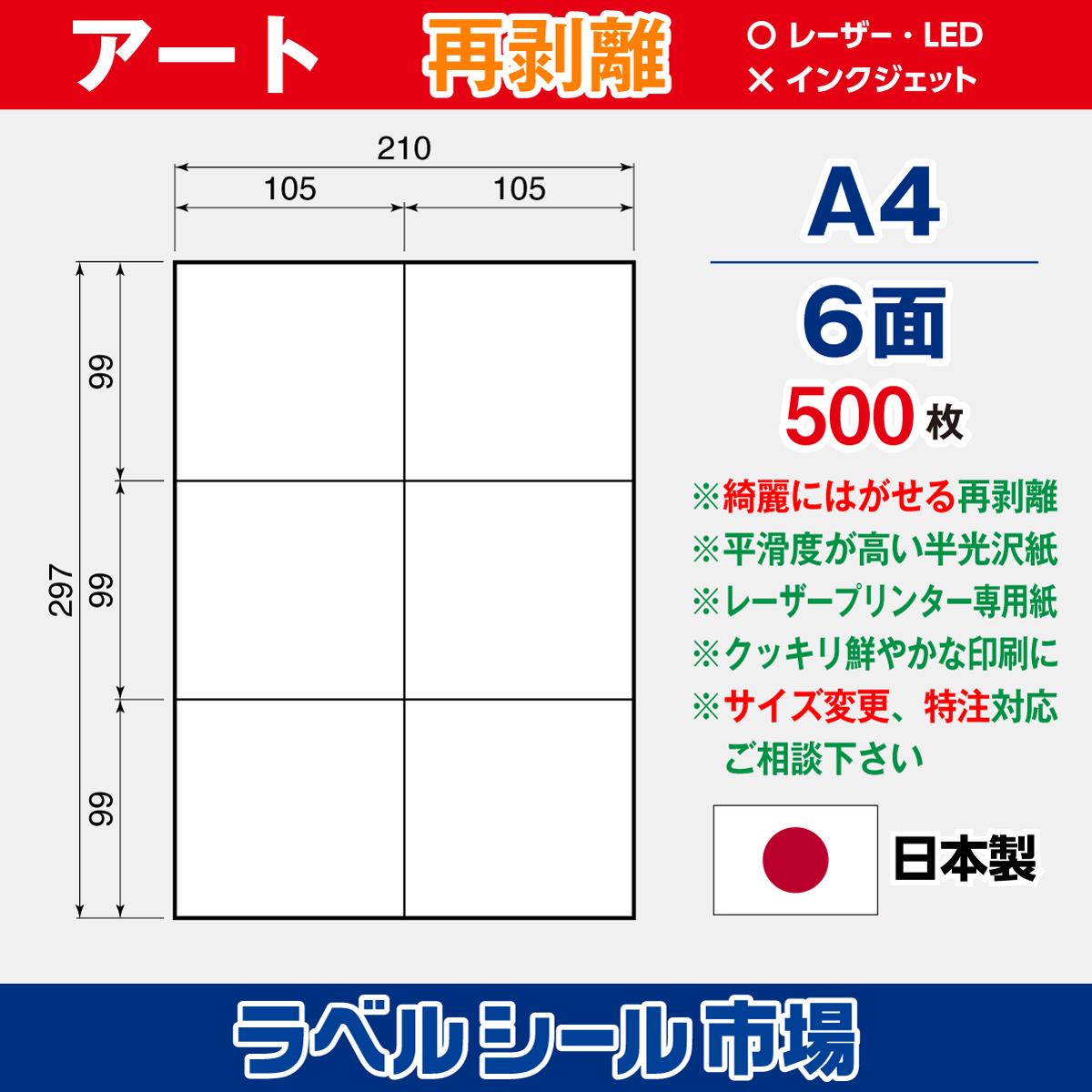再剥離アート紙A4 6面 500枚[レーザープリンタ]