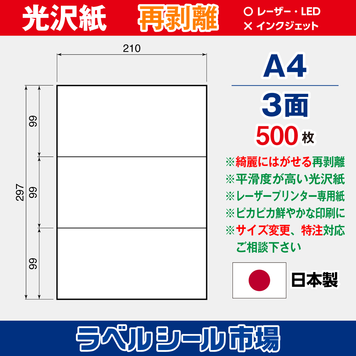 A4-3面 500枚 光沢紙 綺麗にはがせる再剥離T1Y3Crs