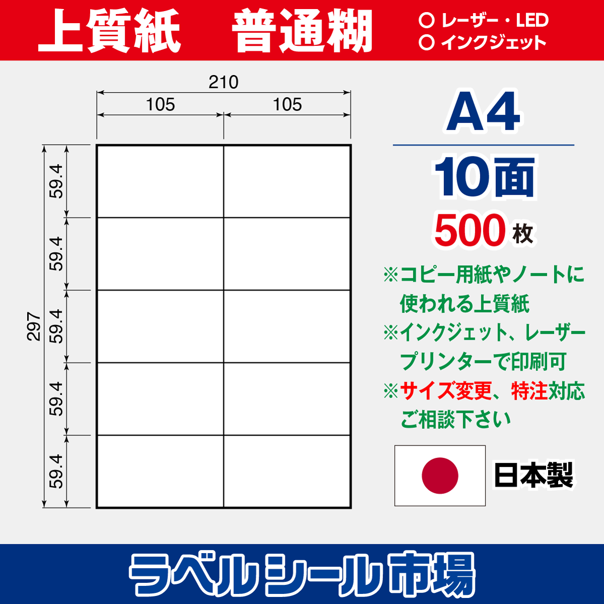 当店で一番人気のラベルシール(タックシール)、A4-10面カット余白なし上質紙500枚セットです。