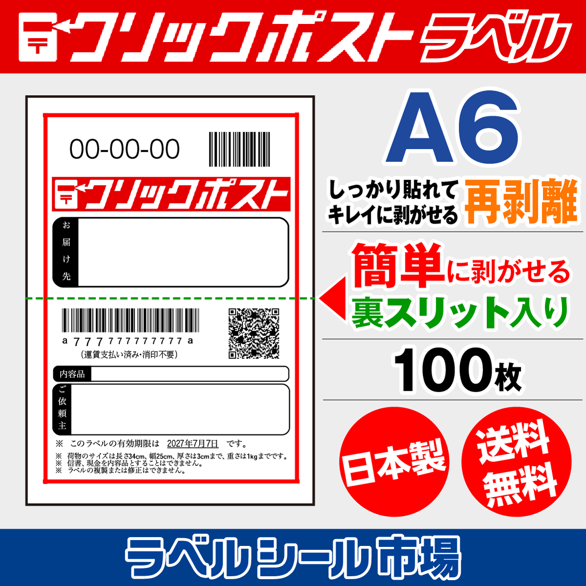 | クリックポスト宛名印刷用ラベル シール A6 再剥離 100枚 裏スリット(背割)入り A6Ars-01 | |