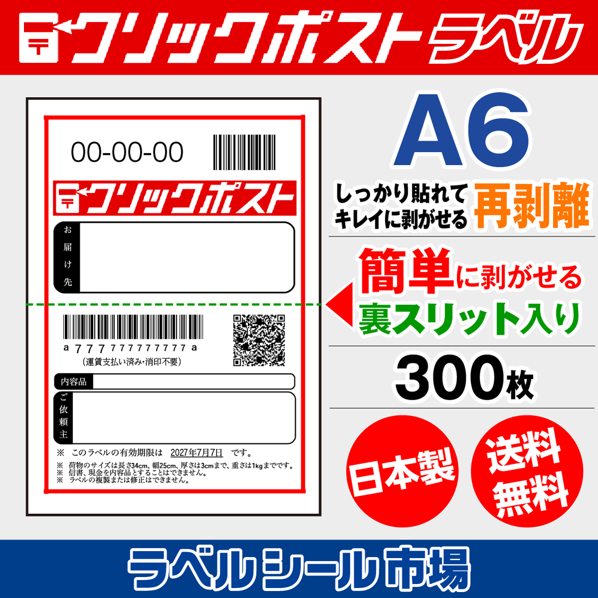 | クリックポスト宛名印刷用ラベル シール A6 再剥離 300枚 裏スリット(背割)入り A6Ars-03 | |
