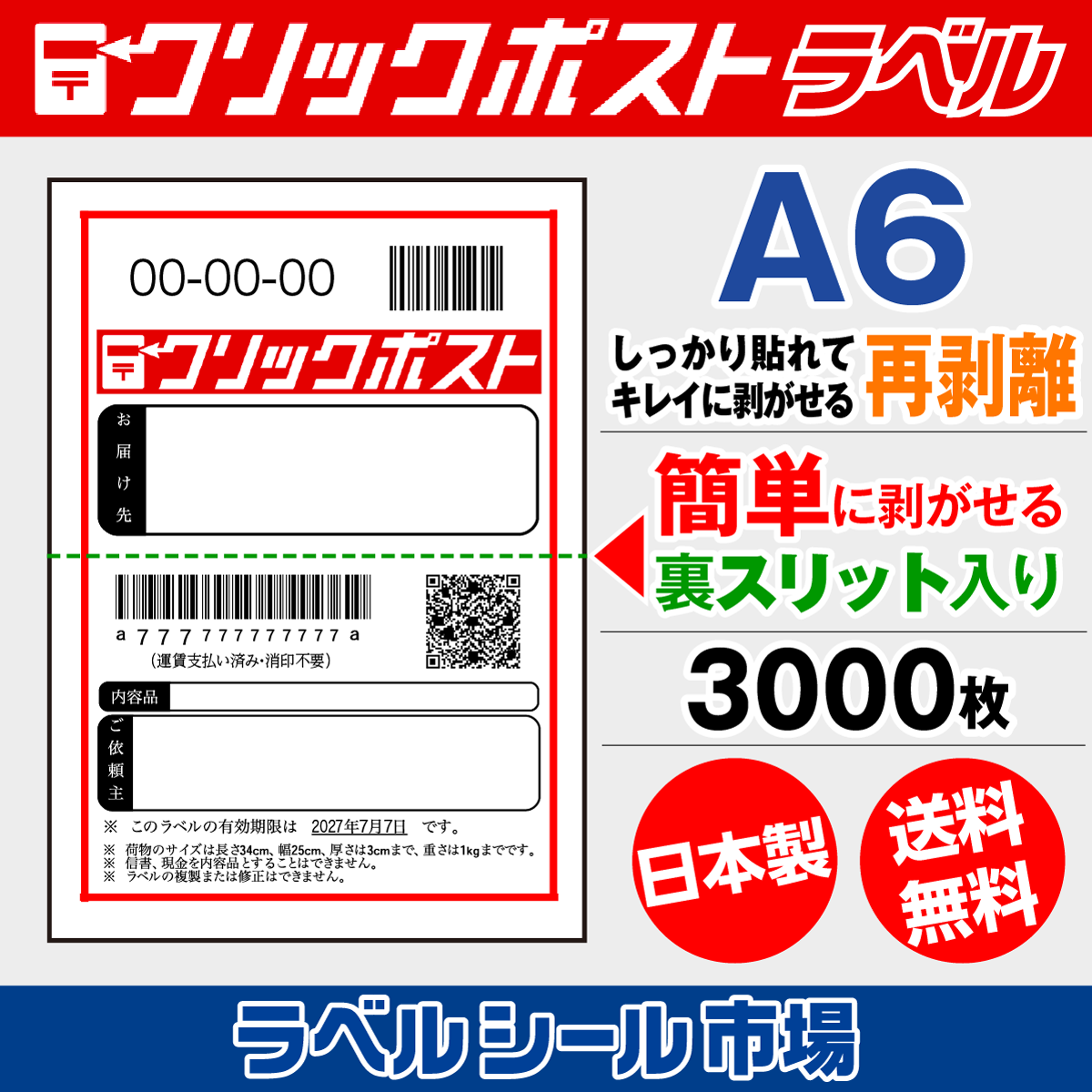 | クリックポスト宛名印刷用ラベル シール A6 再剥離 3000枚 裏スリット(背割)入り A6Ars-30 | |