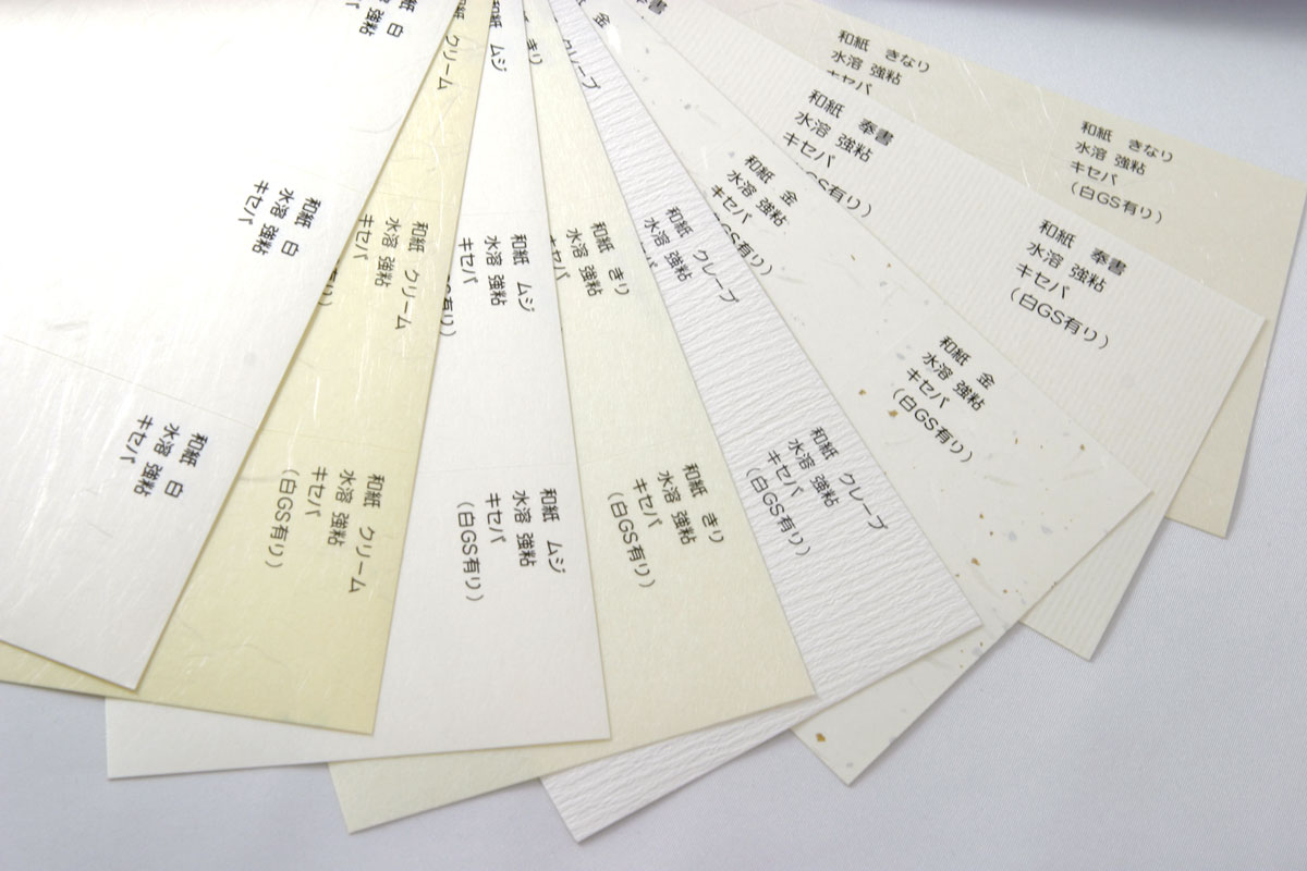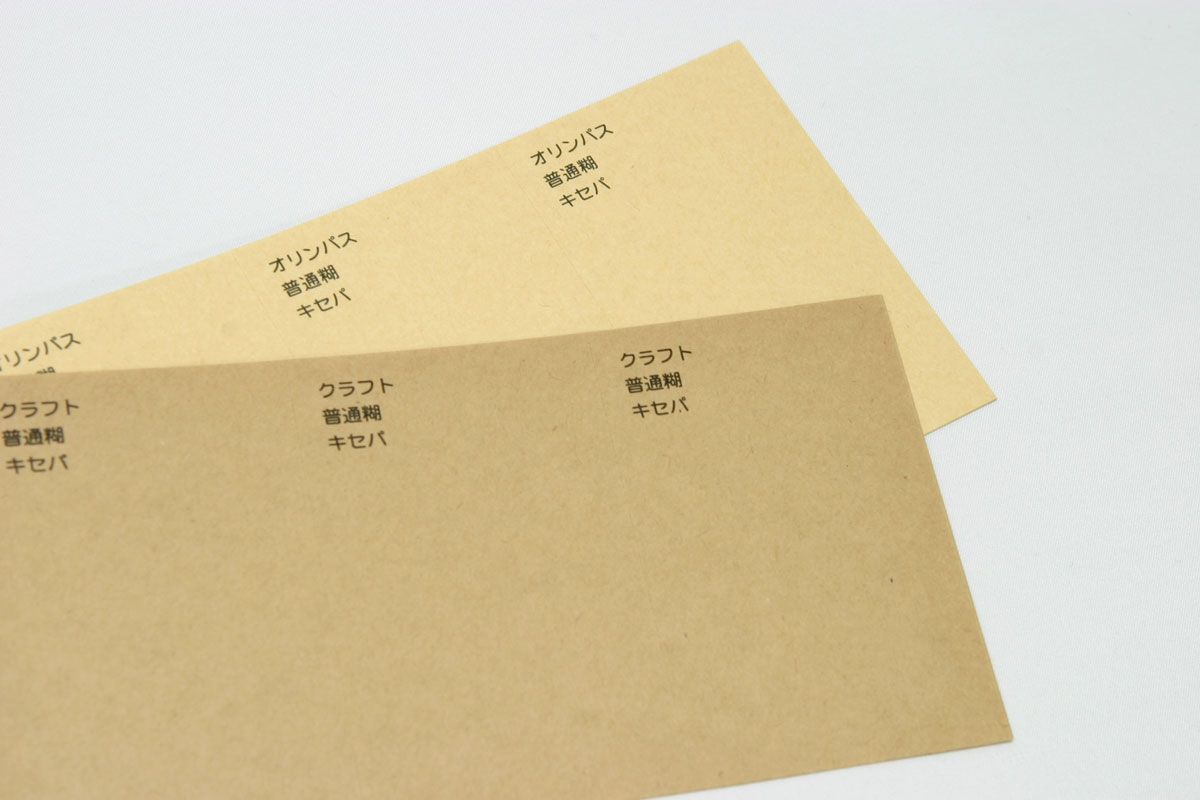 表面に凹凸があるため、インクジェット、レーザーとも、専用紙のようにキレイに印刷できません。インクジェットだと「にじみ」が、レーザープリンターですと、トナーが定着せず「欠け」が発生することがあります。ですが、それを「風合い」として捉え、自社で印刷されているケースもございます。また、暖かみのある整理用のラベルとして使ったり、手作りシールとしても人気があります。