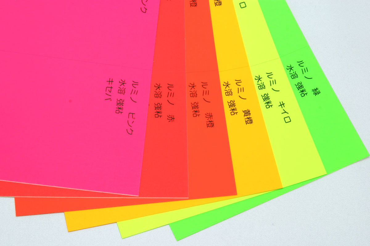 蛍光色でインパクトのあるラベルシールです。成分に金属を含んでいるため、プリンター印刷には適しません。デザイン用、クラフト用としてご利用ください。印刷が必要な場合は弊社にご相談ください。