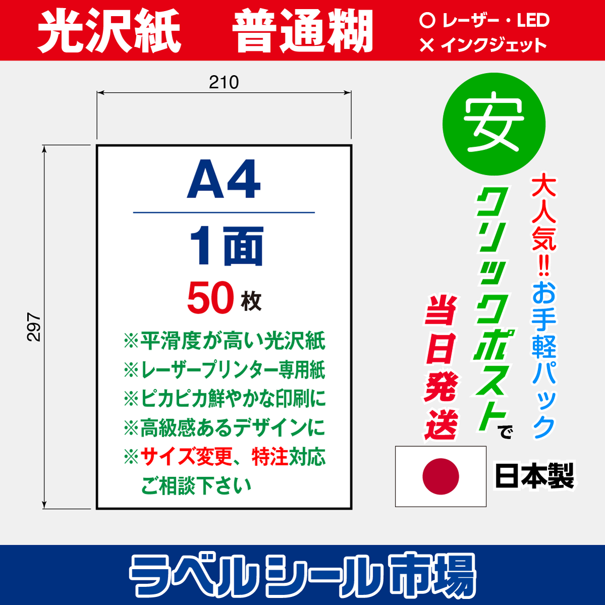 光沢紙A4ノーカット50枚[レーザープリンタ]