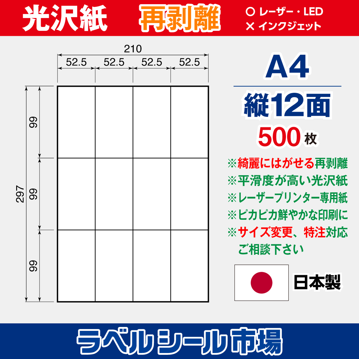 | A4-縦12面 500枚 光沢紙 綺麗にはがせる再剥離T4Y3Crs | |