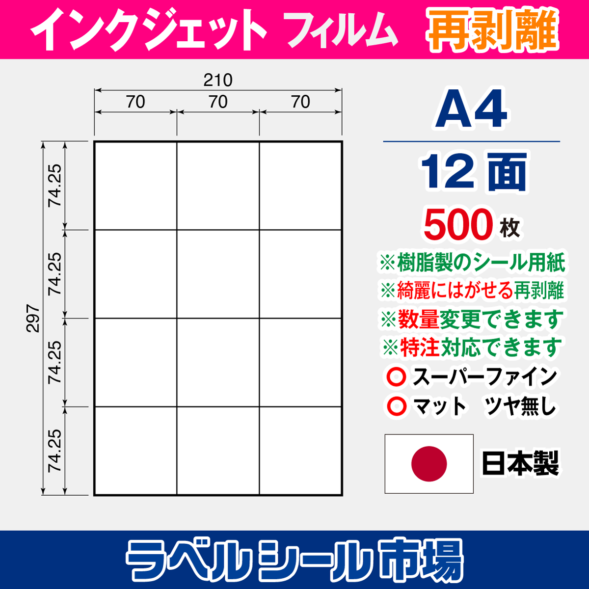 | A4-12面 500枚 フィルムT3Y4iDrh しっかり貼れて綺麗に剥がせる再剥離です。 | |
