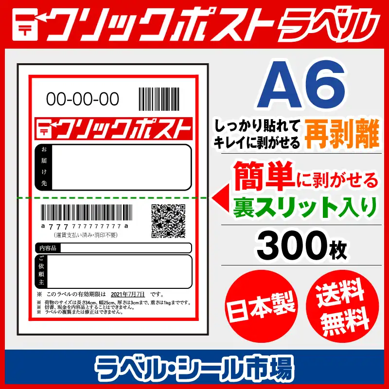 クリックポスト宛名印刷用ラベル シール A6 再剥離 300枚 裏スリット(背割)入り