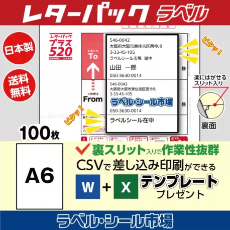 | レターパック宛名印刷用ラベル シール 普通糊 100枚 裏スリット(背割)入り A6AL-01 | |